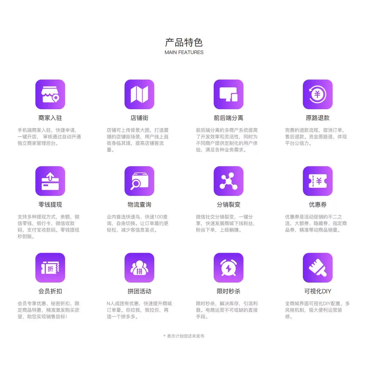 • 支持官方旗舰店、商家入驻、平台抽佣+商家独立结算、统一下单+订单拆分。